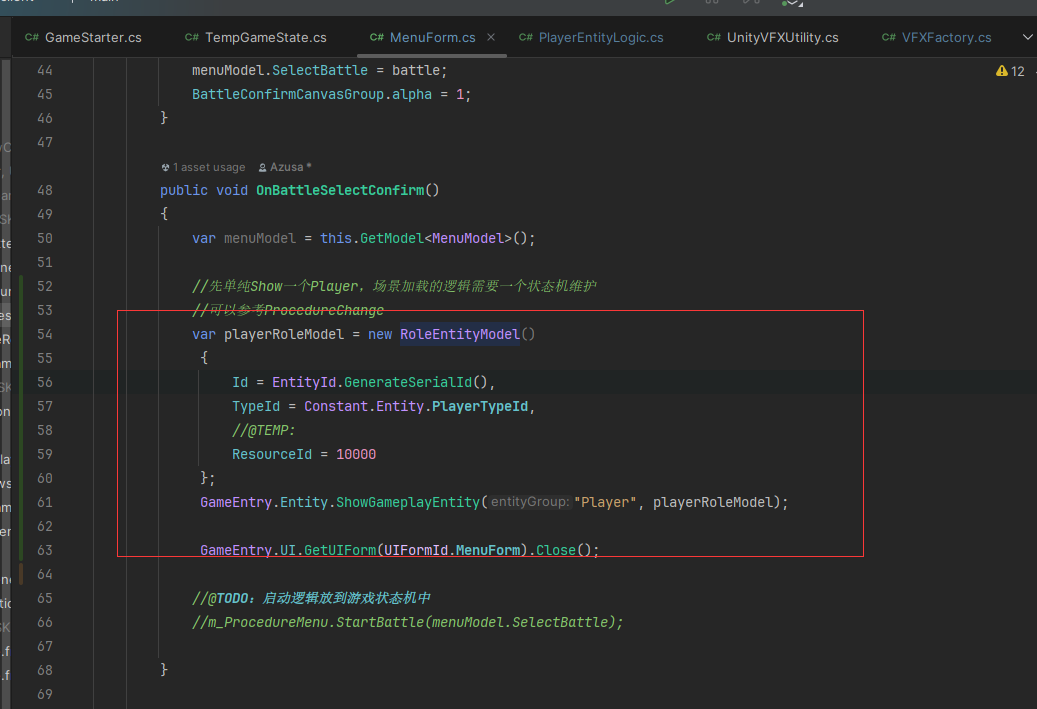 BSKGameExample示例 发表于 2024/12/30 作者 MingXi 1 分钟阅读进入Launch场景选中GameFramework,确保EditorResourceMode勾选 开始游戏,选择任意一个人形按钮,点击右上方弹出的确认战斗按钮,我们就进入了游戏,创建了一个Player实体,Player实体加载出了一个正方形和圆柱体模型,并且自动获取了圆柱体头的位置播放了一个配置在VFX表格中的特效 创建Player代码请参考MenuForm中的OnBattleSelectionConfirm。我们从GameStarter进入,打开了MenuForm,然后从点击的按钮进入了我们的游戏逻辑——创建Player Player代码逻辑请参见client的PlayerEntityLogic和gameplay的PlayerGameplayEntity(目前PlayerGameplayEntity中没有逻辑) 可以在面板上看到生成的实体的层级结构 本文由作者按照 CC BY 4.0 进行授权 分享